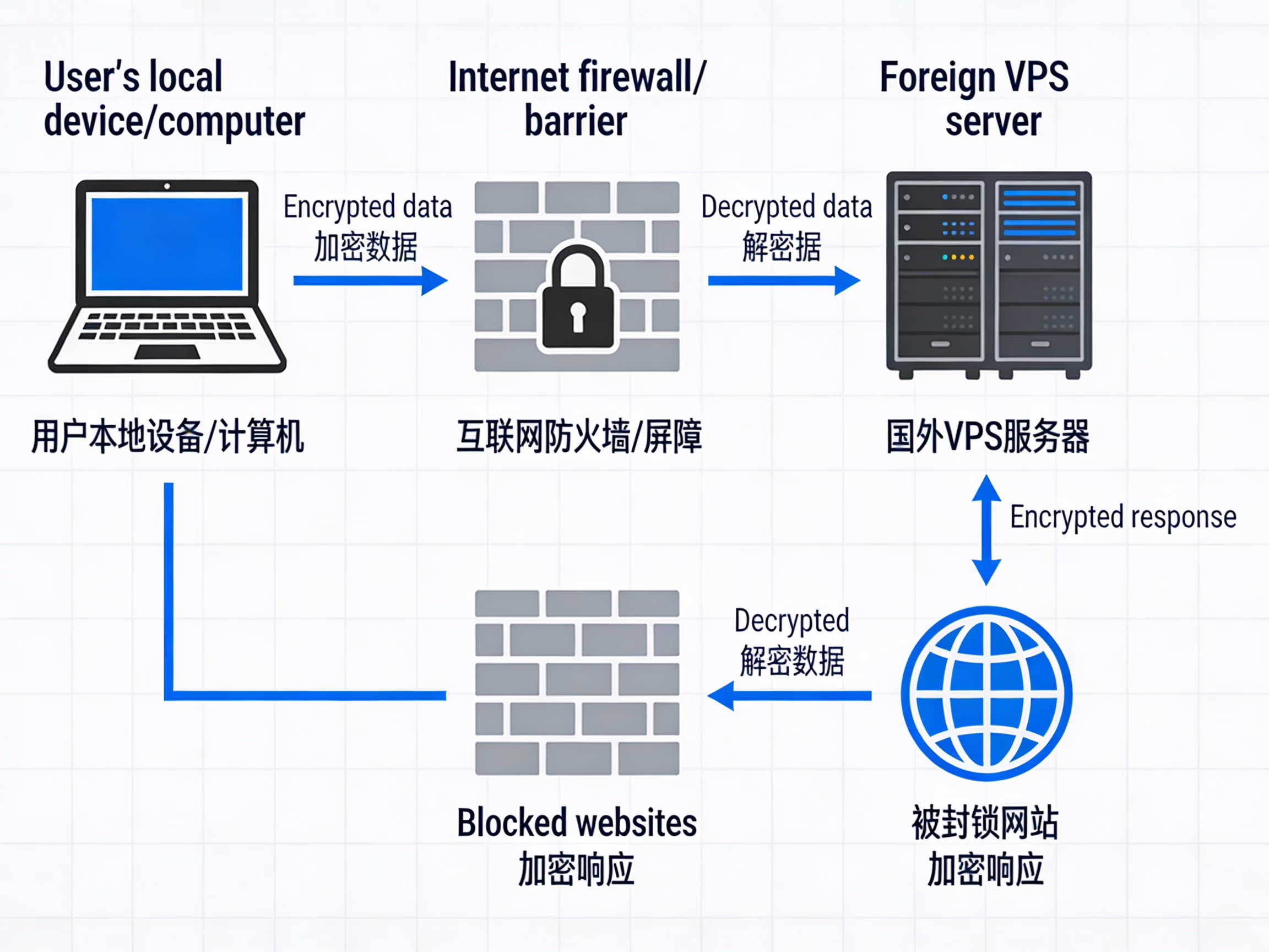 SSR 的基本原理如下:本地用戶端把資料加密後,透過加密隧道發給國外 VPS 上的 SSR 服務端,再由服務端代你訪問目標網站,返回資料時同樣加密後傳回本地。